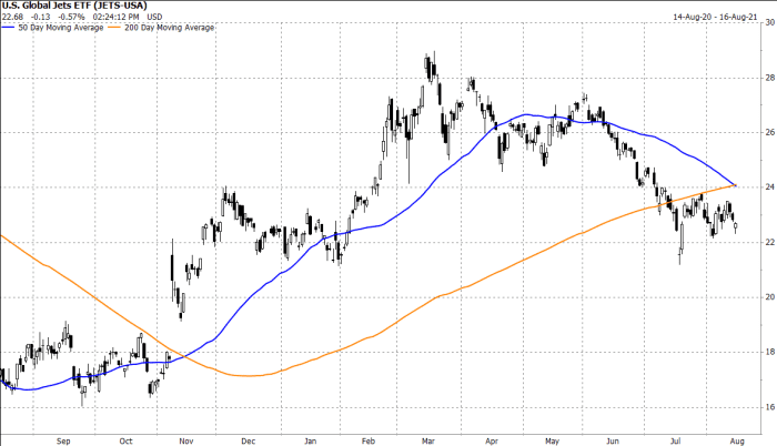 A chart of the Jets ETF (JETS), which has been steadily declining over the past several months, has produced an ominous-sounding technical pattern known as a “death cross,” which warns of further potential losses.